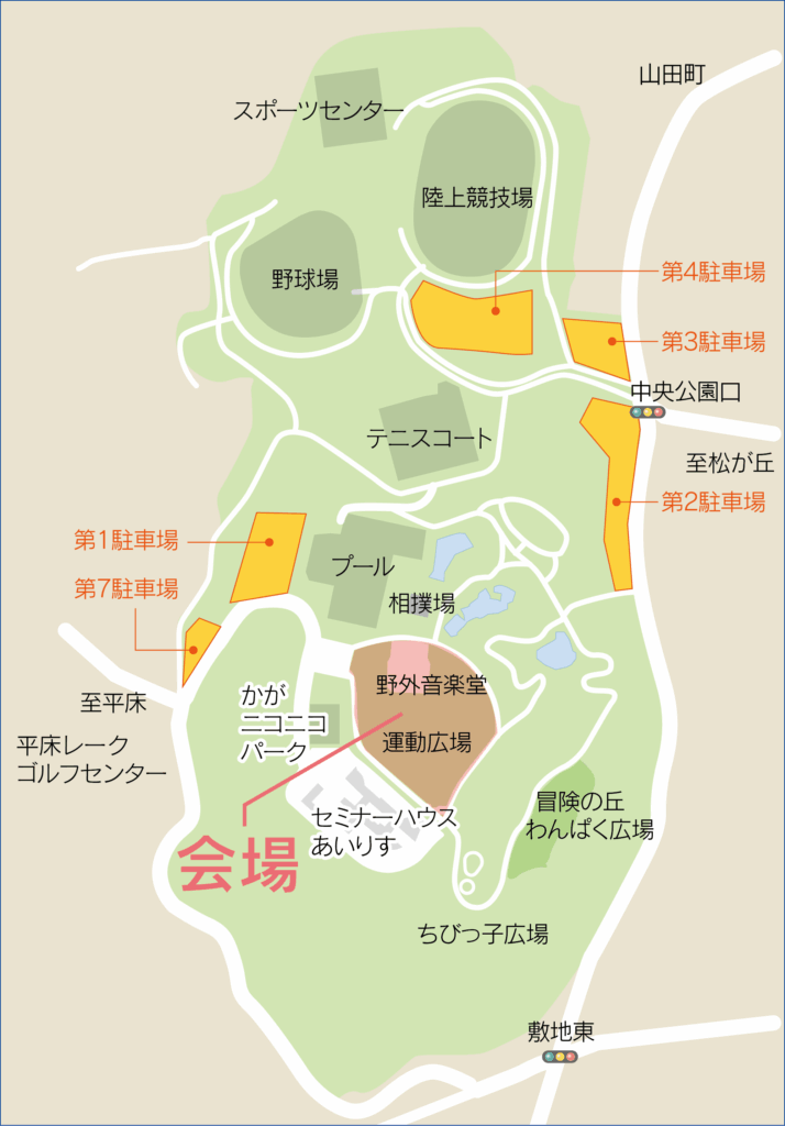 当日参加の方は、中央公園に駐車できない恐れがあるため、医療センター駐車場に駐車ください。